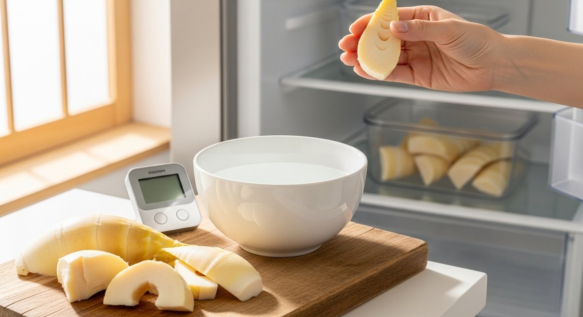 下ゆでが終わったら、お鍋に流水を注いで早めに温度を下げることが大切です。完全に冷めたら、皮をむいて速やかに冷蔵庫へ入れましょう。熱いまま冷蔵庫に入れると庫内の温度が上がり、他の食材にも悪影響を与えてしまいます。しっかり冷やしてから保存するという基本の手順を守ることが、たけのこを守る第一歩になります。