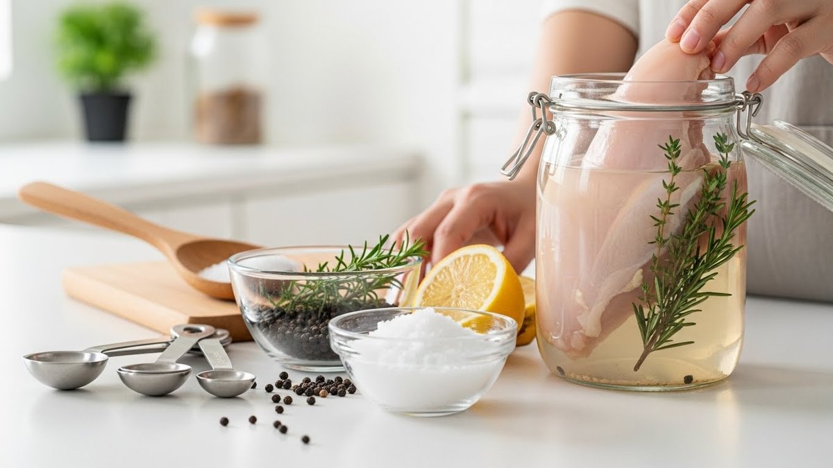 鶏肉は比較的浸透が早く、しっとりさせたい場合は水1リットルに塩40g(4%)砂糖20gで30分〜4時間を目安にします。胸肉は短め、もも肉は中程度の時間で十分です。