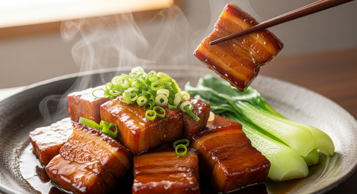 豚バラは脂身が多く、煮込むと脂が柔らかく溶け出します。ゼラチン質が多いので、冷めると煮汁がプルンと固まることがあり、食感としてはとろりとした口当たりになります。脂の甘みが強く、タレの味を包み込むため全体がまろやかになります。