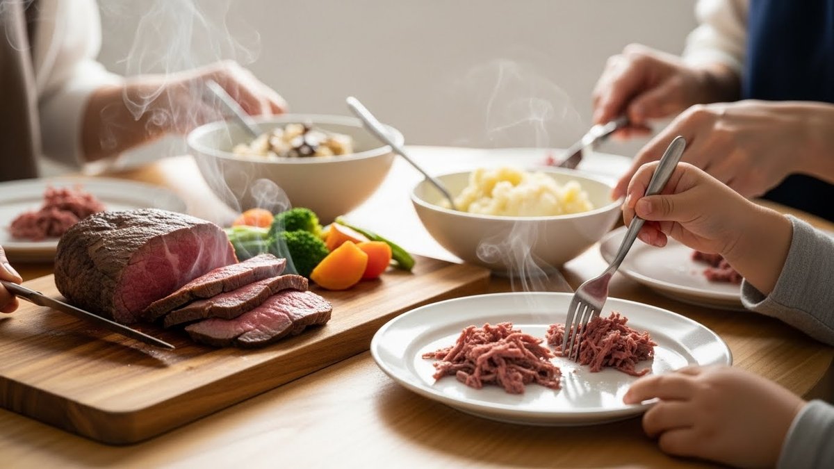 ローストビーフは繊維質が残りやすく、半生の状態だとリスクが高まります。ハンバーグや薄切りの焼き肉、煮込み料理は柔らかく加工しやすく、幼児向けには扱いやすい選択肢です。消化や嚥下の面で心配がある場合は、まずはこれらの料理で肉に慣れさせるのがおすすめです。