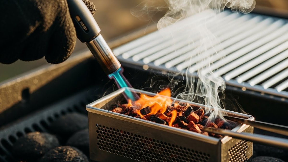 簡単な着火手順は次の通りです。まずチップをスモークボックスやアルミホイルに入れ、薄く広げます。チャッカマンやライターで片側を短く炙り、炎が消えた後に赤くくすぶるのを確認します。