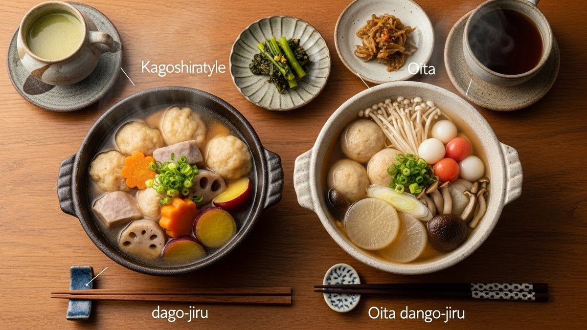 熊本では一般的に「だご汁」と呼ばれることが多く、平たいだごを使う家庭が多い傾向があります。大分では「だんご汁」という呼び方が広く使われ、丸い団子を入れることが多い点が知られています。どちらも地域の食文化を反映しており、具材や味付けにも地域色が出ています。