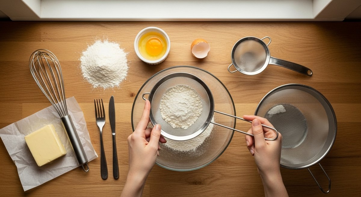混合が不均一だと、一部だけ膨らみ過ぎたり苦味が出たりすることがあるため、粉類を合わせてからふるうか、個別にふるってから合わせると良い結果が出ます。ざるや茶こしでの合わせ技も有効です。