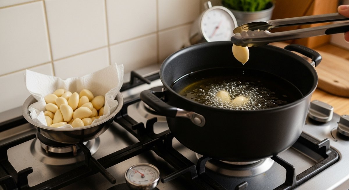 油温を急に高くすると、にんにく内部の水分が瞬間的に膨張して爆発や激しい油はねを起こします。最初は中火でゆっくり温度を上げ、油が160~170℃くらいになってから入れると安全です。専用の温度計があれば正確に管理できます。