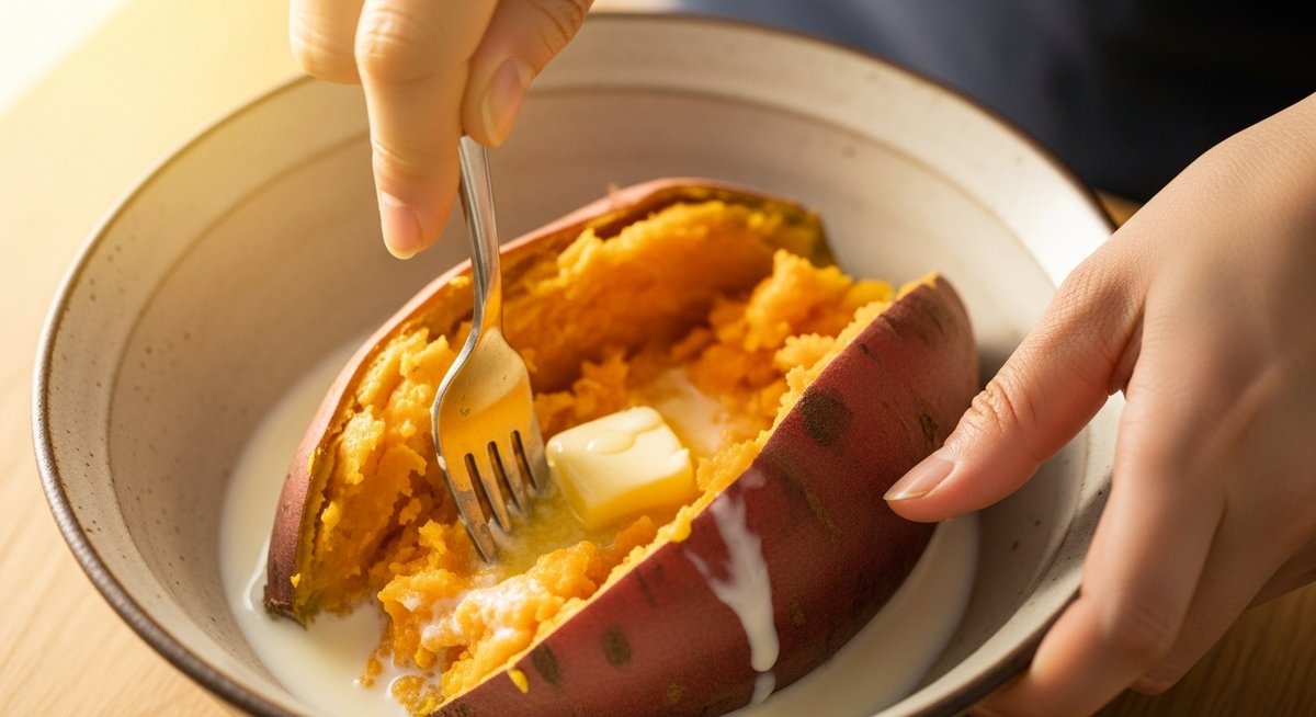 つぶしたさつまいもに牛乳や生クリーム、バターなどを加えると、固かった繊維も滑らかなペースト状に馴染んでいきます。この状態になれば、サラダやコロッケ、スイーツなど、活用の幅が一気に広がります。