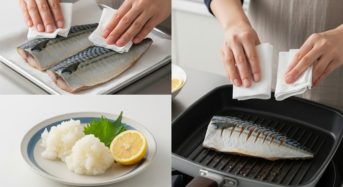 解凍したサバを調理器具に入れる直前に、ぜひ行ってほしいのが「表面の水分をキッチンペーパーで拭き取る」という作業です。解凍されたサバの表面には、どうしてもわずかな水分が付着しています。この水分が残ったまま焼いてしまうと、皮がパリッと仕上がらないだけでなく、魚の生臭さが身に残ってしまう原因になります。ほんの数秒の手間ですが、これが仕上がりのクオリティを大きく左右します。