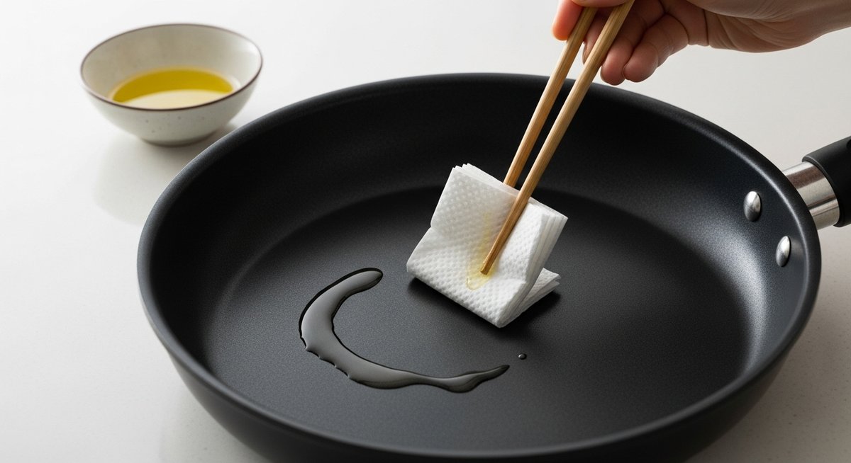 フライパンを予熱してから油を引くと、油の粘度が下がり、より薄く広がりやすくなります。冷たいフライパンに油を置いて拭き取るよりも、温まった表面をペーパーでサッと拭く方が、均一な膜を作りやすいです。