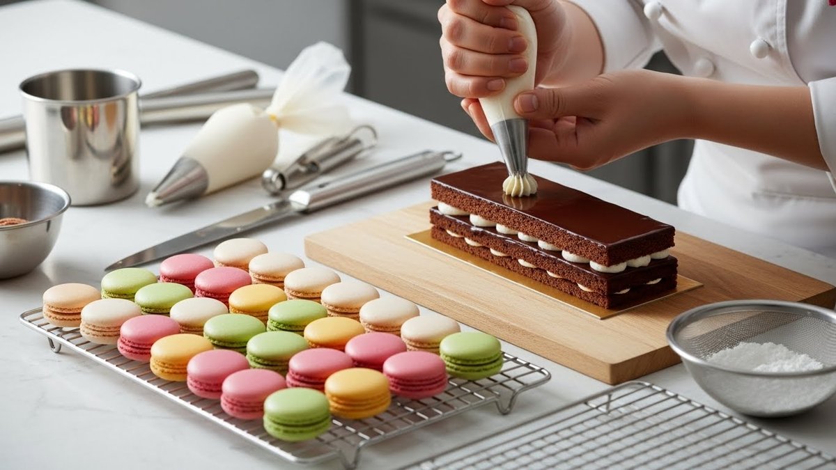 マカロンはメレンゲの立て方とマカロナージュの加減が重要で、生地の硬さや光沢が仕上がりを左右します。乾燥時間は気温や湿度で変わるので、触って指に生地がつかない状態を確認してから焼くと良いです。