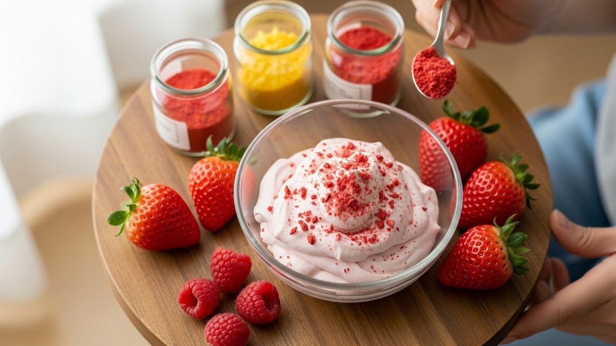 ピンクにするには、色が濃くて水分が少ない素材を使うと扱いやすいです。フリーズドライいちごやピューレ、ジャム、野菜パウダーなど、望む色合いや風味に合わせて選びます。