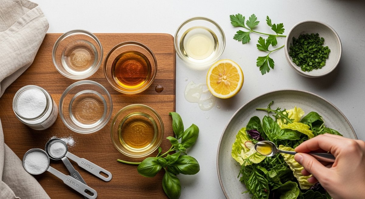 ドレッシングやマリネにはレモン汁、白ワインビネガー、りんご酢が適しています。油と合わせる際は酸と油の割合を1:3程度から試すと失敗が少ないです。ハーブや塩こしょうを加えて風味を調整してください。