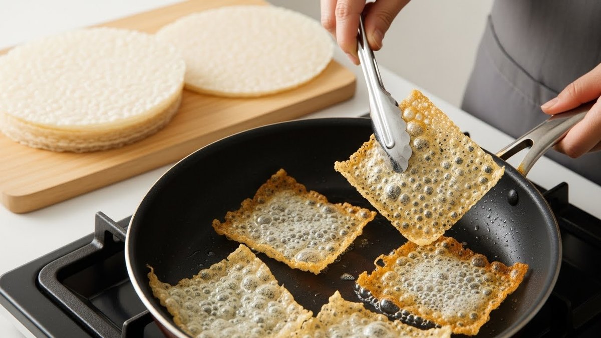 ライスペーパー料理を完璧に仕上げる最後のコツは、火を止めるタイミングにあります。全体がほぼパリッとしてきたら、完全に硬くなる前に火を止め、フライパンの余熱で最後の水分を飛ばしましょう。ずっと火にかけ続けていると、最後に残った僅かな水分が原因で一部が溶け出したり、逆に焦げすぎたりすることがあります。