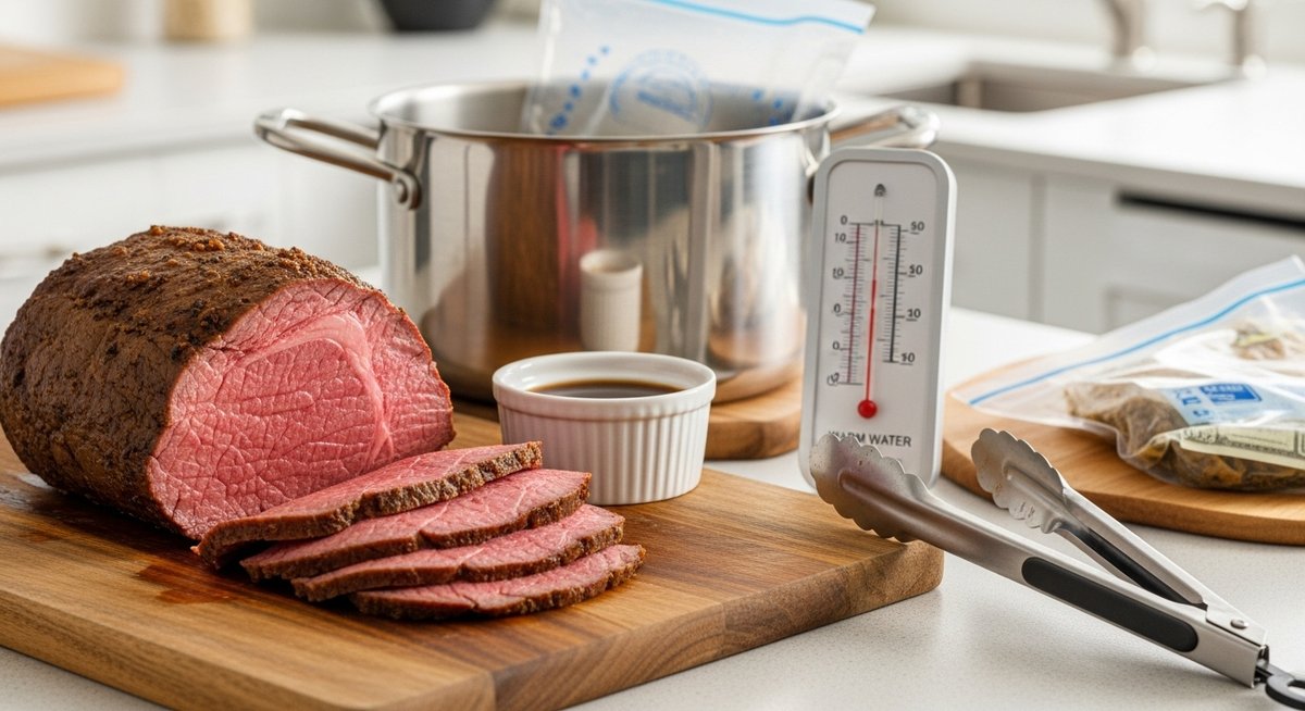 ローストビーフを温める際、最も失敗が少なく推奨されるのが「湯煎」による方法です。しかし、ここで最も注意すべきなのが「お湯の温度」です。沸騰したお湯に直接入れてしまうと、お肉に急激に火が通り、ローストビーフ特有のピンク色の断面が茶色く変色し、固くなってしまいます。これではせっかくの高級肉が台なしです。