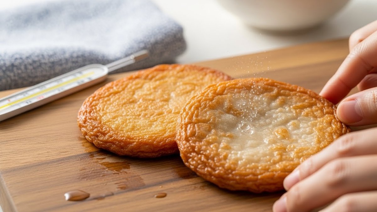 さつま揚げは少し油っぽくなることがあるので、油を抜くと食べやすくなります。キッチンペーパーで挟む、熱湯をくぐらせて油を落とす方法が有効です。熱湯に軽くくぐらせたあとフライパンで焼くと食感が戻りやすくなります。