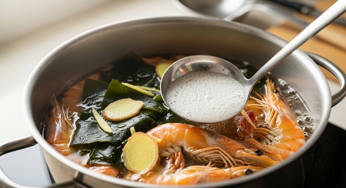 海老出汁作りでよくある失敗は、アク取りの不足と加熱しすぎです。特に沸騰して最初に出てくるアクには臭みの元が集中しているため、ここを丁寧に取り除くだけで後味が劇的にスッキリします。