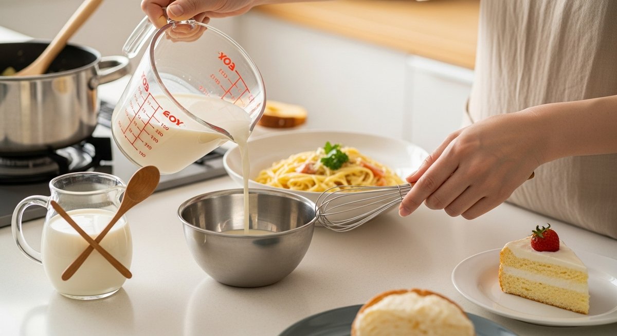 料理では風味やコクを重視するため、豆乳をそのまま使うか、1:1での置き換えが便利です。ソースやスープでは濃厚さが求められるため、豆乳を少し煮詰めるか、片栗粉・小麦粉でとろみを補うと良い仕上がりになります。風味付けにバターを少量加えるとまろやかさが出ます。