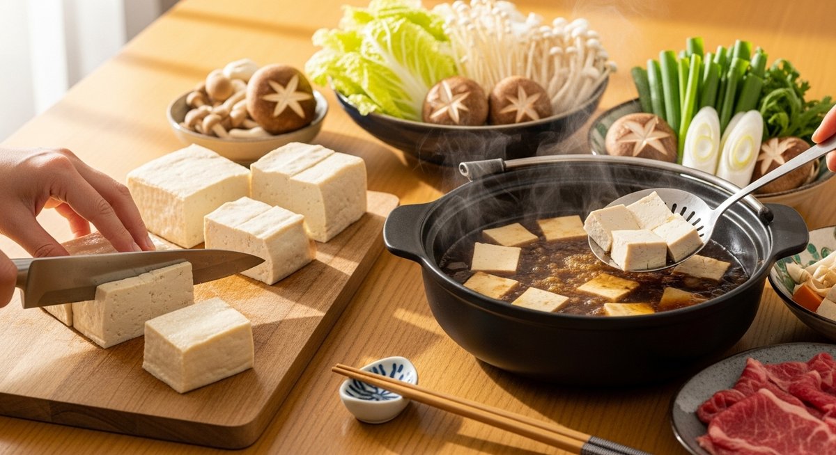お鍋に入れるタイミングは、お肉に軽く火が通り、割り下が沸騰し始めた中盤あたりがベストです。野菜から出る水分と割り下が馴染んだ状態のつゆに木綿豆腐を沈めると、大豆の味を残しつつも、しっかりと深みのある味に仕上がります。一度味が染みれば冷めても美味しいため、多めに作っておいて翌日の楽しみとするのも木綿豆腐ならではの贅沢です。厚切りにして、お出汁の重みをしっかりと感じられる状態で提供してみてください。
