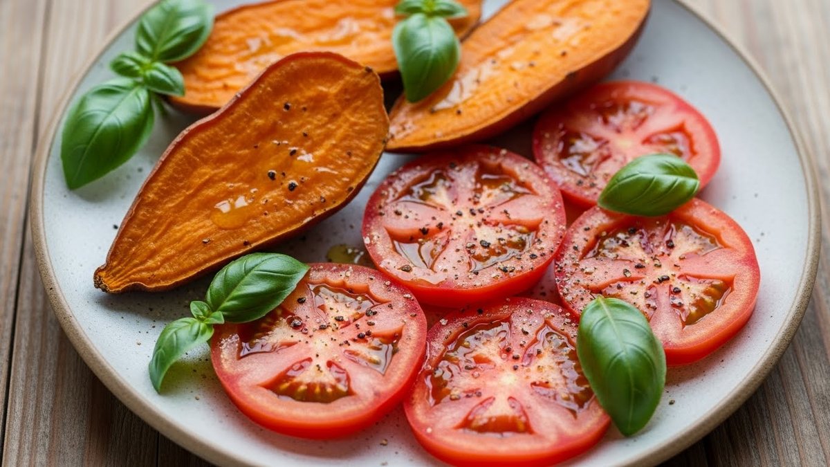 さつまいもをオーブンでローストし、トマトを同時に焼くと香ばしさと甘酸っぱさが同時に楽しめます。ハーブやガーリックオイルを少量使うと風味が引き立ちます。